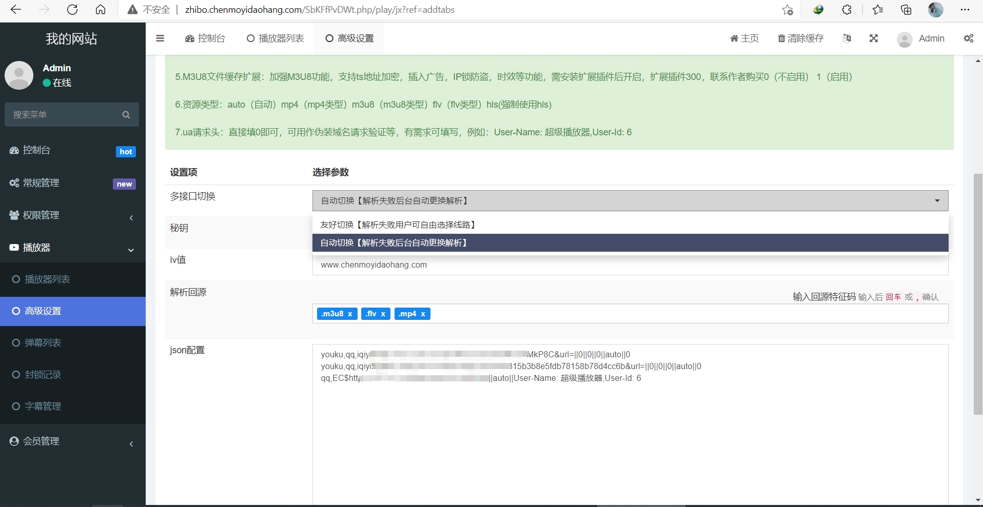 2.json配置默认回源设置了.m3u8,.mp4意味着资源地址中包含这两个字符串就不会进行解析而是直接播放